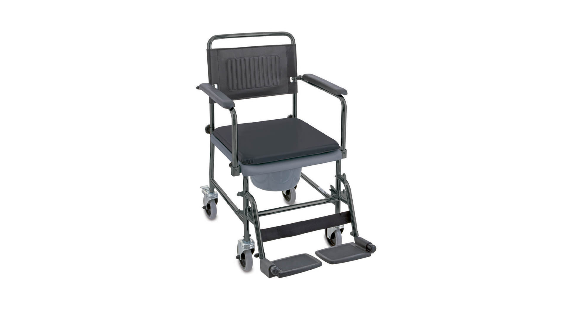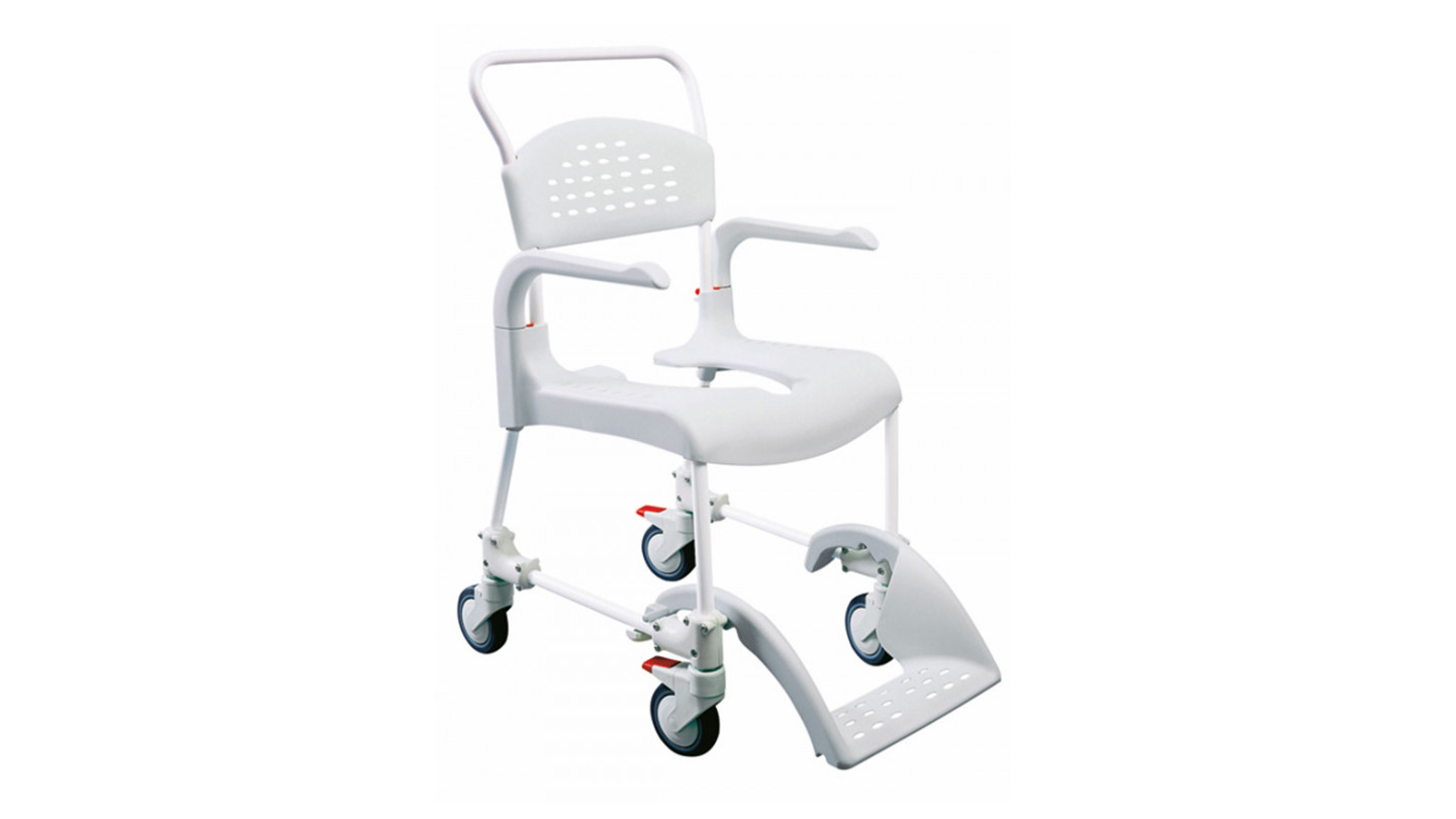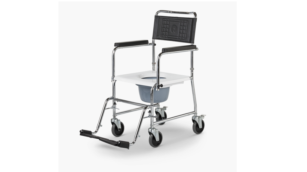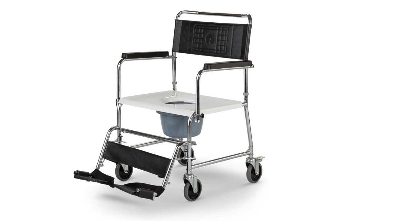 Ein Dusch-Toilettenrollstuhl zum Schieben.