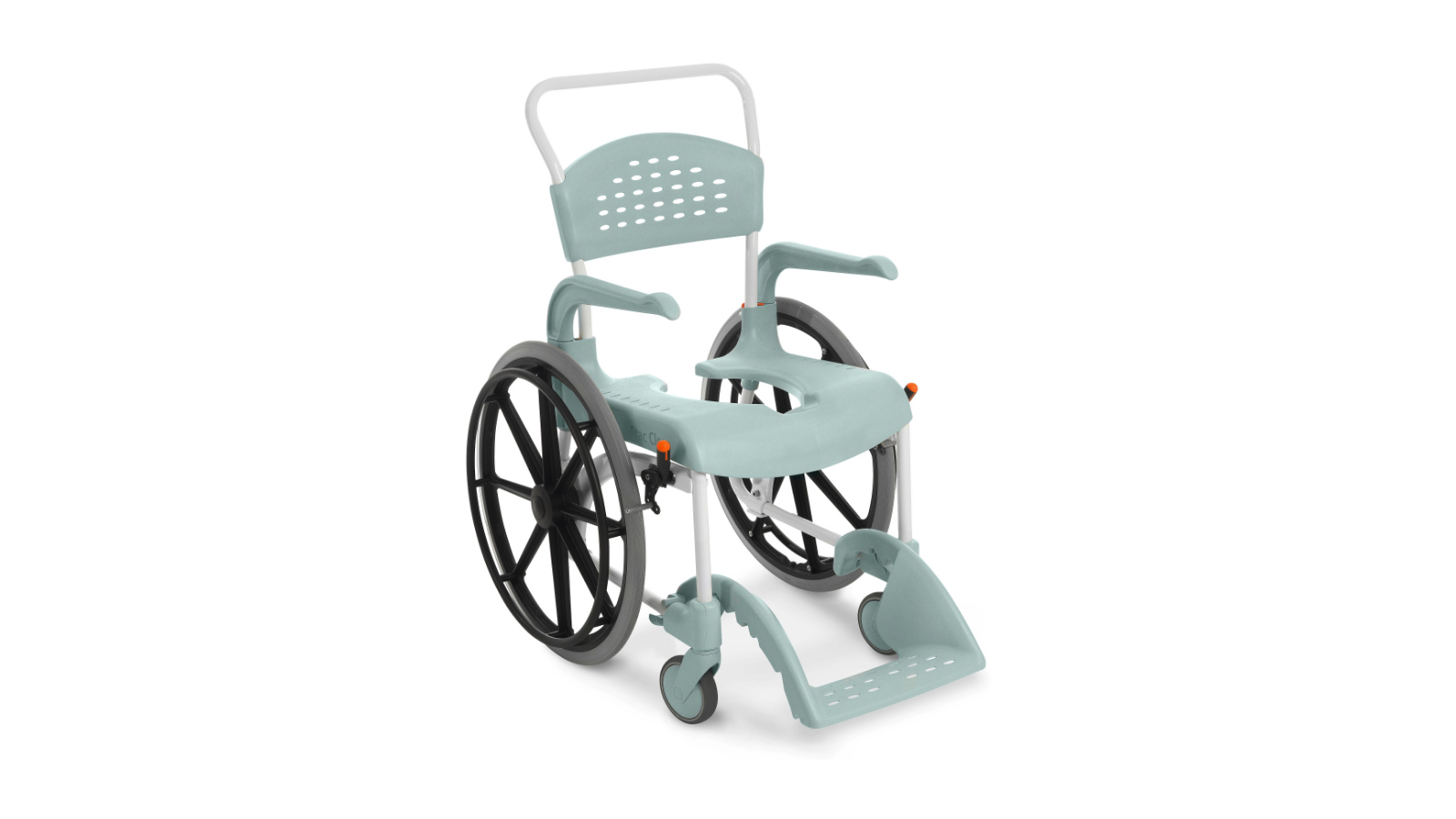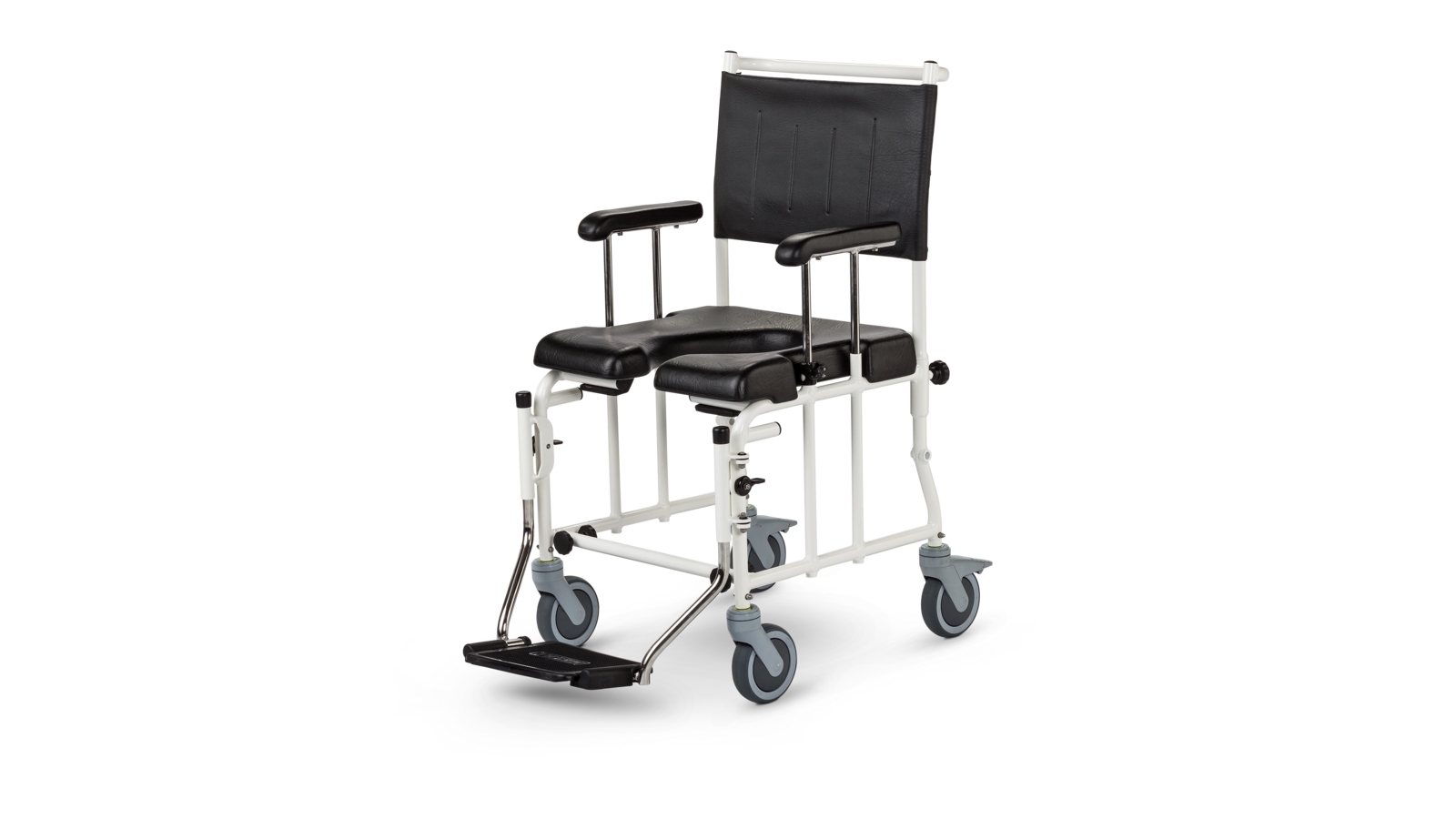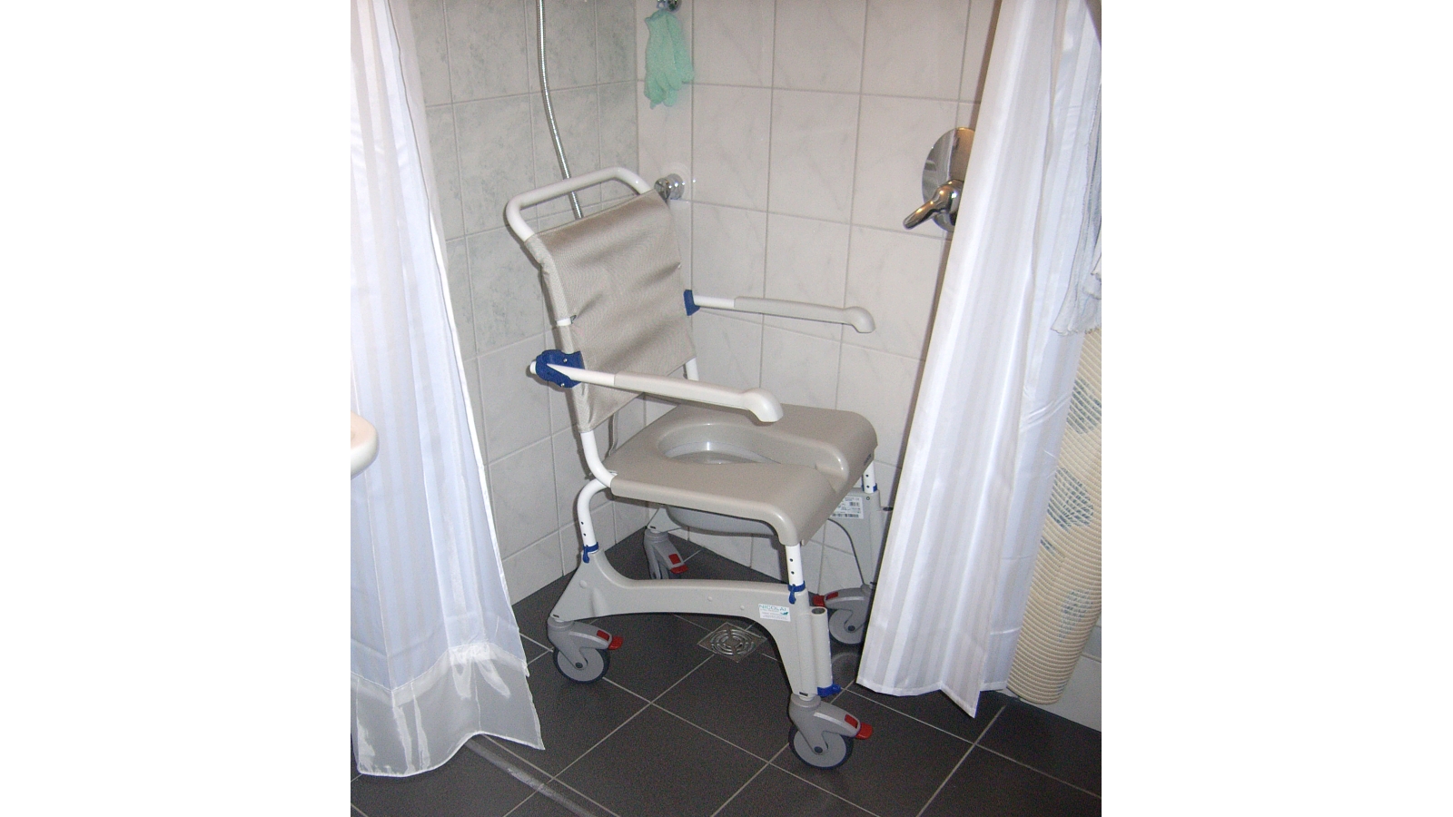 Ein Dusch-Toilettenrollstuhl zum Schieben.