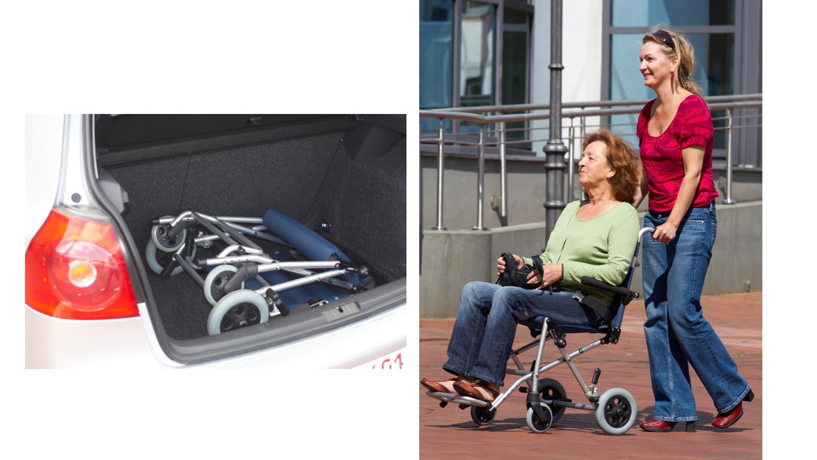 Für den kurzzeitigen Transport von Personen gibt es Reise- bzw. Transitrollstühle.